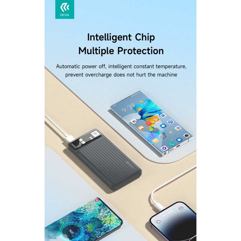Introducing the Devia Smart Series 10000mAh Power Bank - 12W - Black, your ultimate travel companion for uninterrupted power on the go. Engineered with a high-capacity 10,000mAh battery, this sleek and compact power bank ensures your devices stay charged throughout the day, whether you're on a business trip or exploring new destinations. Equipped with a 12W rapid charging feature, the Devia Smart Series efficiently fuels your smartphone, tablet, or other USB-powered devices, providing swift and reliable power when you need it most. Its smart charging technology intelligently detects and delivers optimal charging speeds, safeguarding your devices against overcharging and overheating.